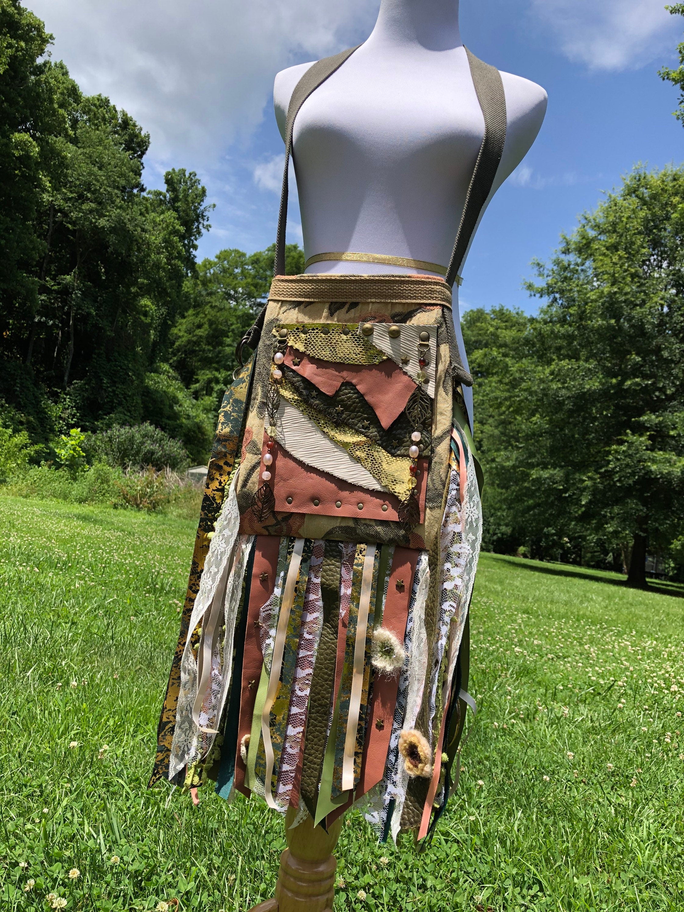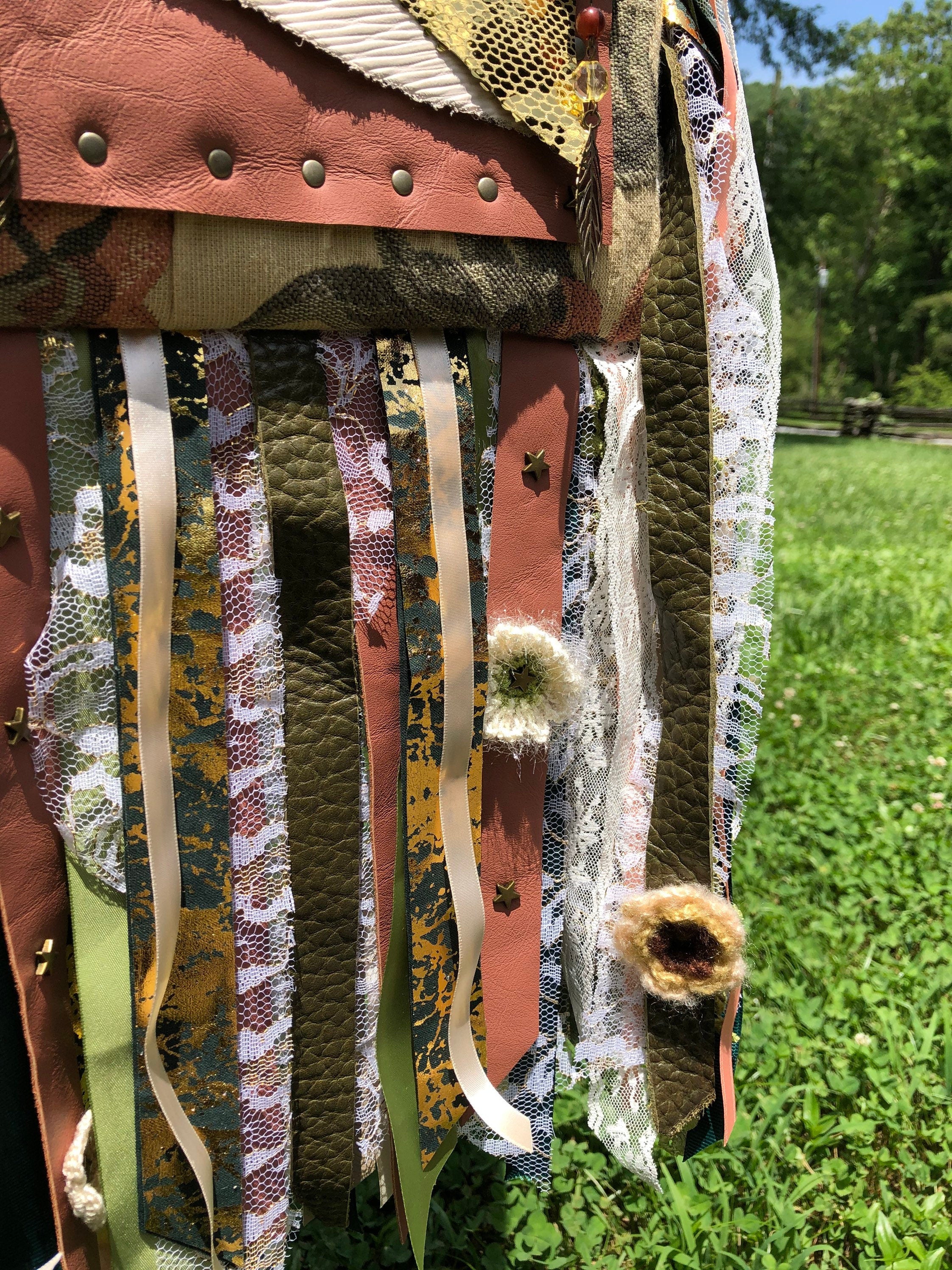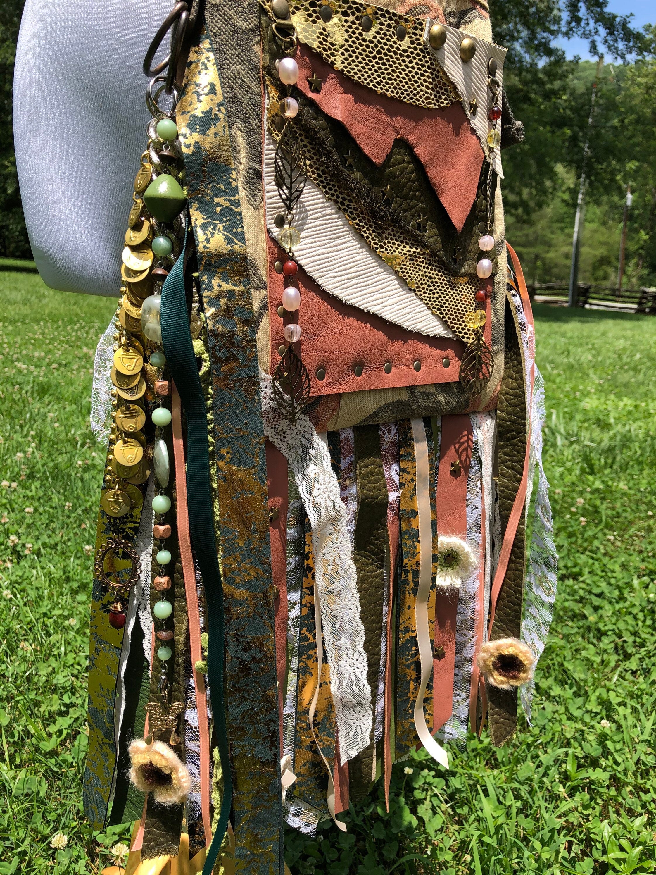 Handmade out of recycled leather scraps, recycled fabrics, vintage jewelry, deconstructed costume jewelry, belts, and sooooooo much more. So many hidden treasures all over this bag. Charms and trinkets tucked away that will shimmer in the sun.