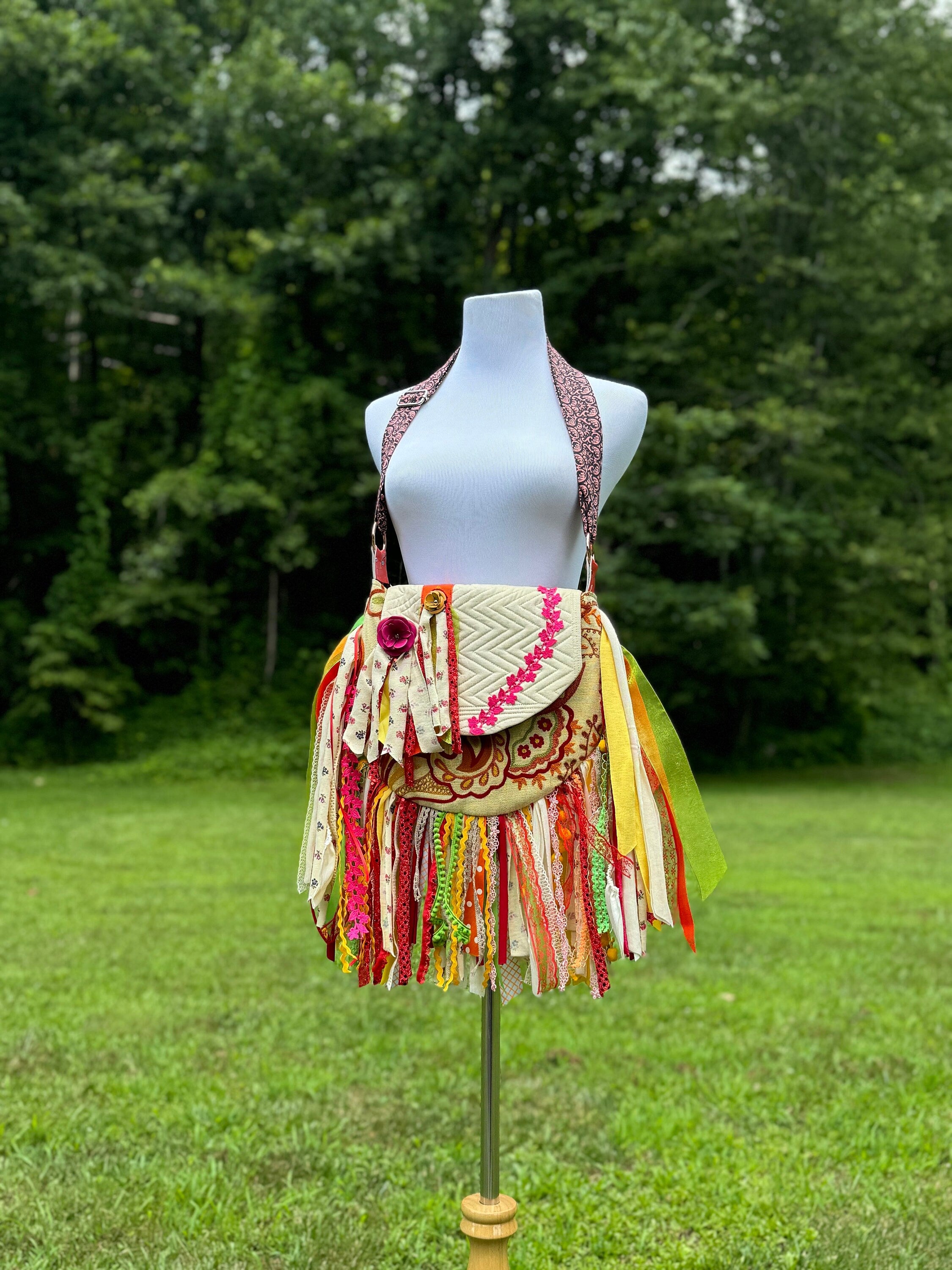 Upcycled lace fringe bag Adjustable Strap length 32-54” Bag length 10” Bottom fringe Length 7” ish Bag width 11.5" 1 inside pocket...