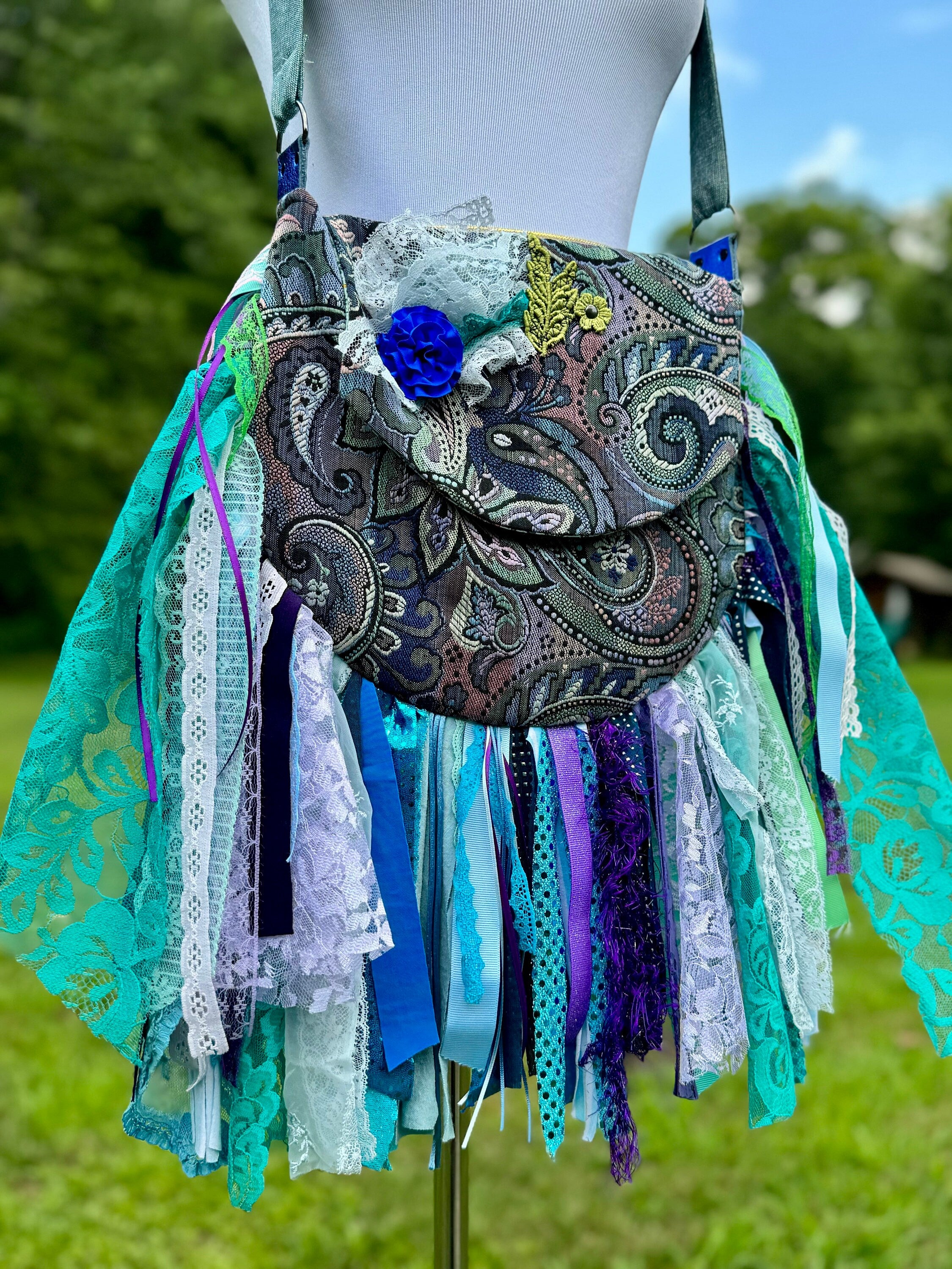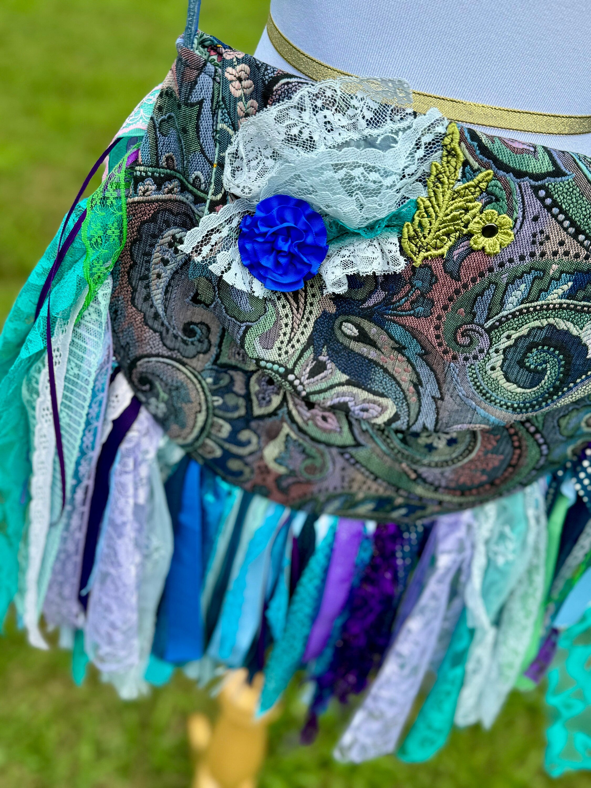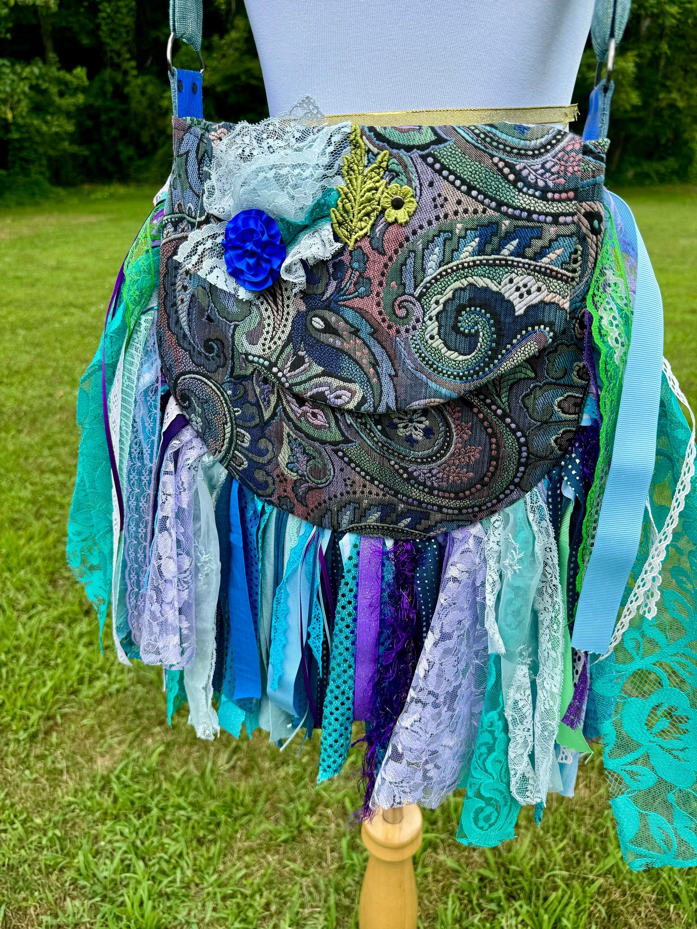 Upcycled lace fringe bag Adjustable Strap length 33-58” Bag length 9.5” Bottom fringe Length 8” ish Bag width 11.5" 1 inside pocket...