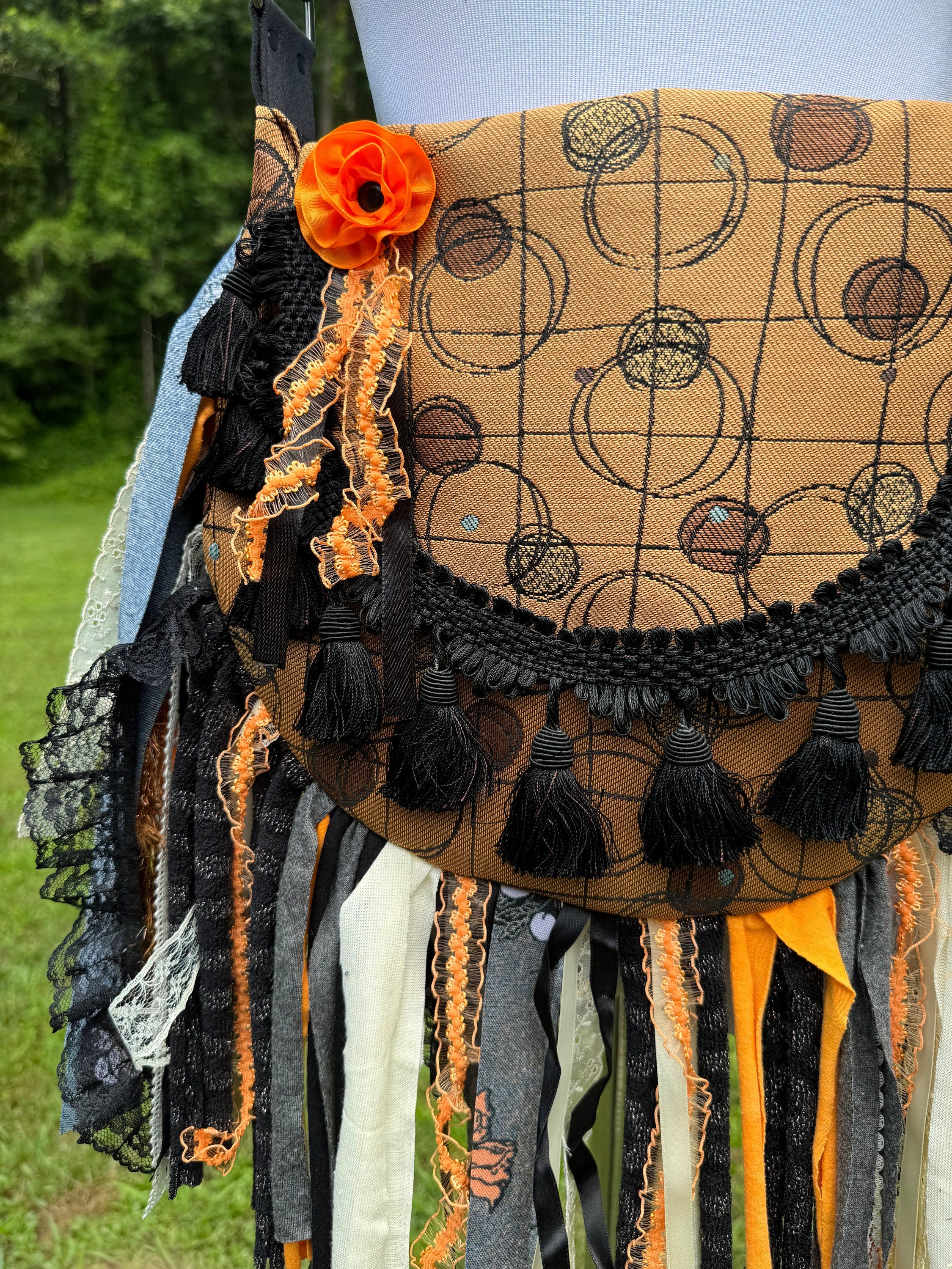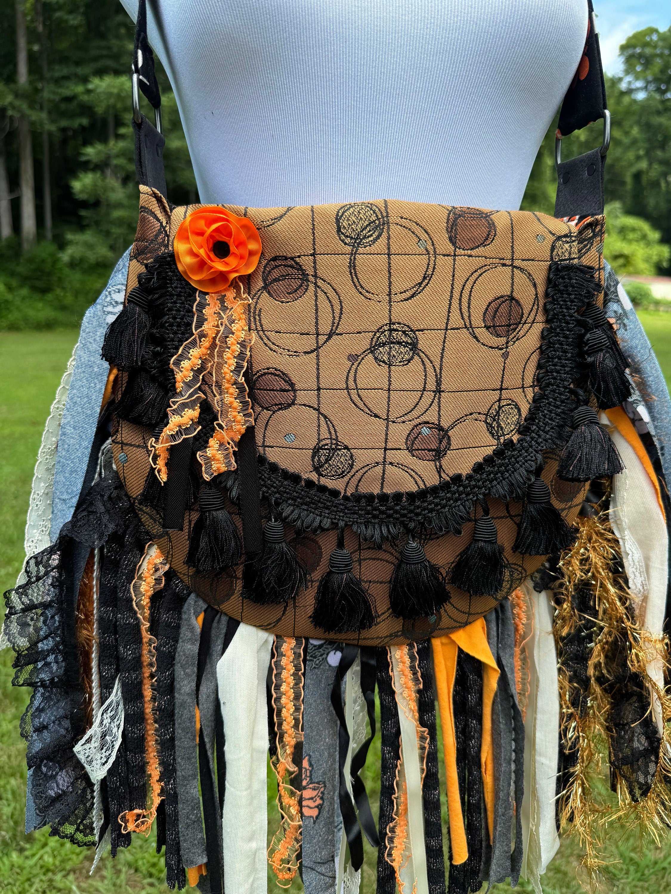 Embrace the Boho Vibe: Black and Orange Lace Fringe Purse, Hippie Handbag with Chic Embellishments!