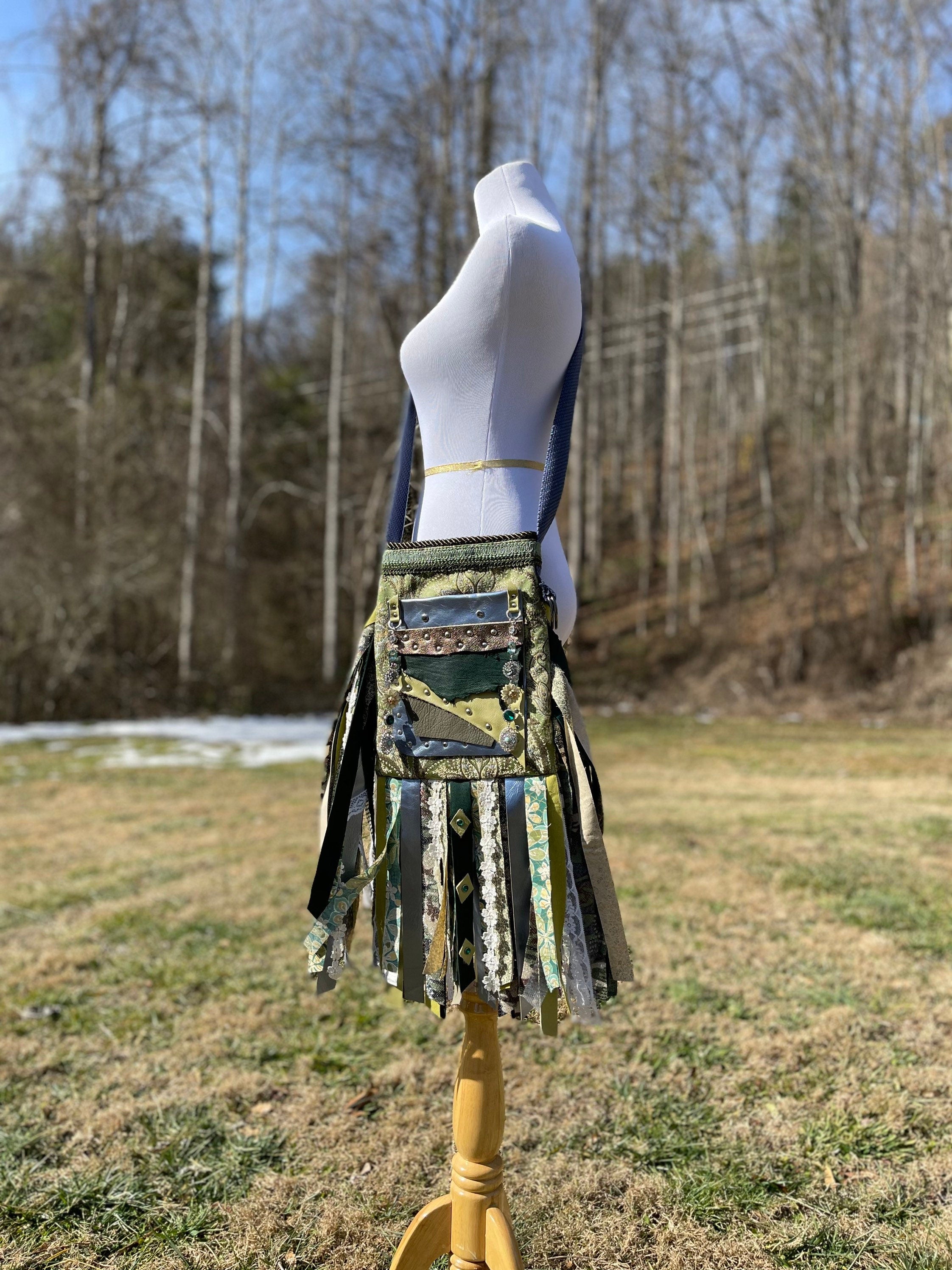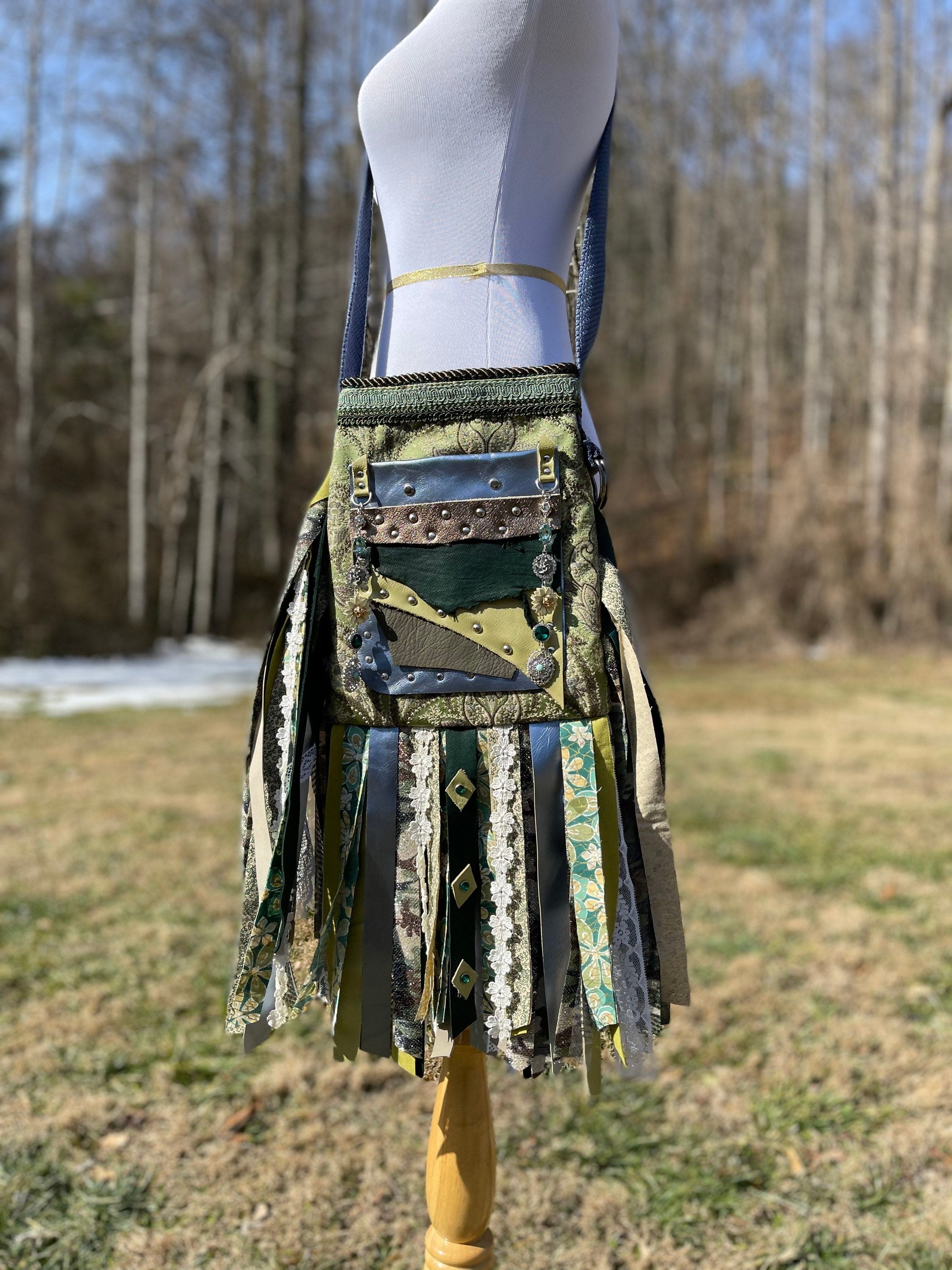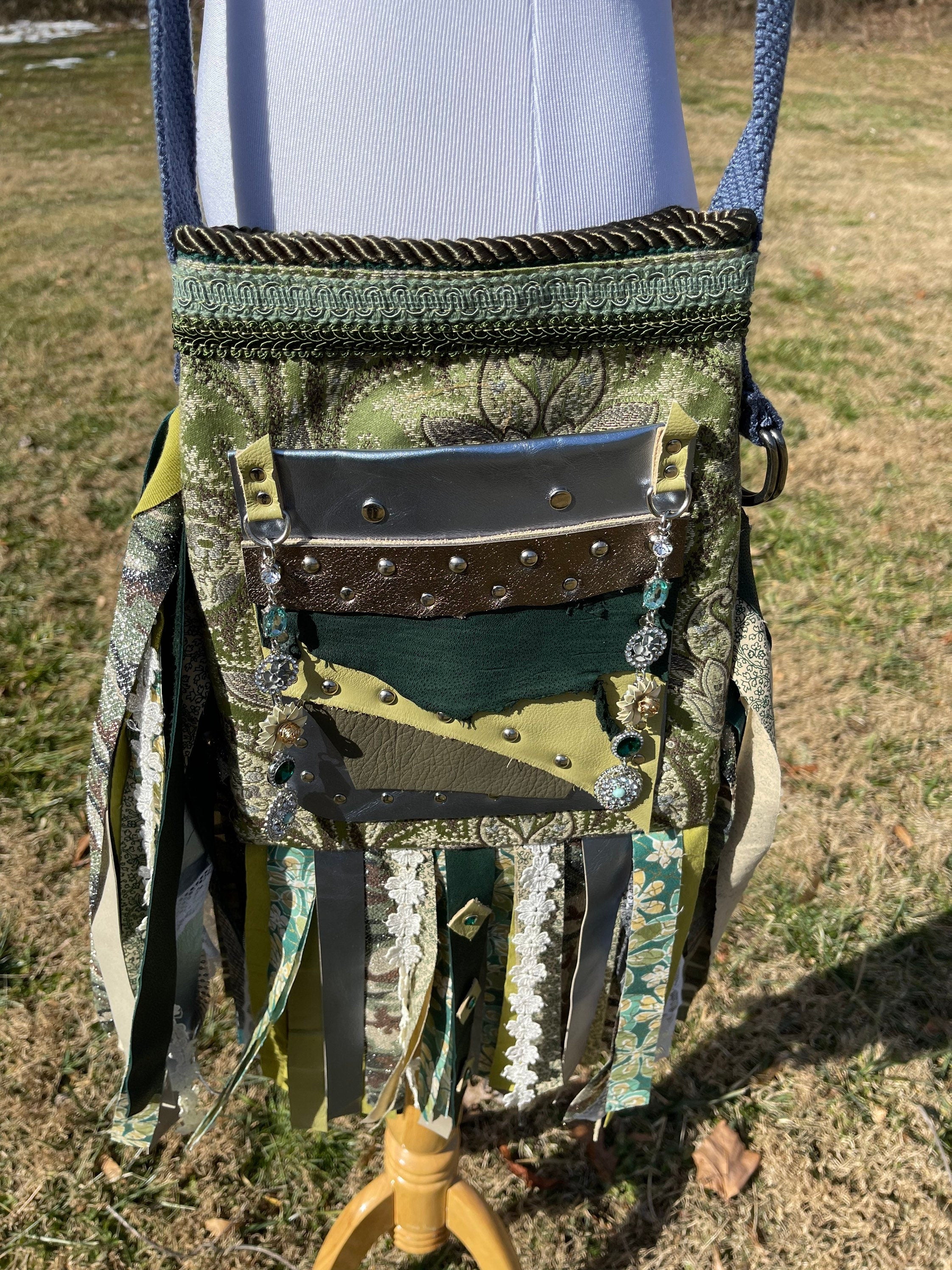 I am a craft supply hoarder, saving every scrap, bead, button, jewel you can imagine. With an overflowing studio and a brain about to explode with ideas, I've created these ultimate fringe purses. Just about everything is recycled materials, except the rivets and threads used to sew with. I use upholstery and leather scraps from mostly local stores, I hunt for belts, vintage jewelry, costume jewelry and fabrics from local shops and some Esty sellers. I deconstruct broken jewelry that would otherwise be garbage to some and make it into something new all over again.