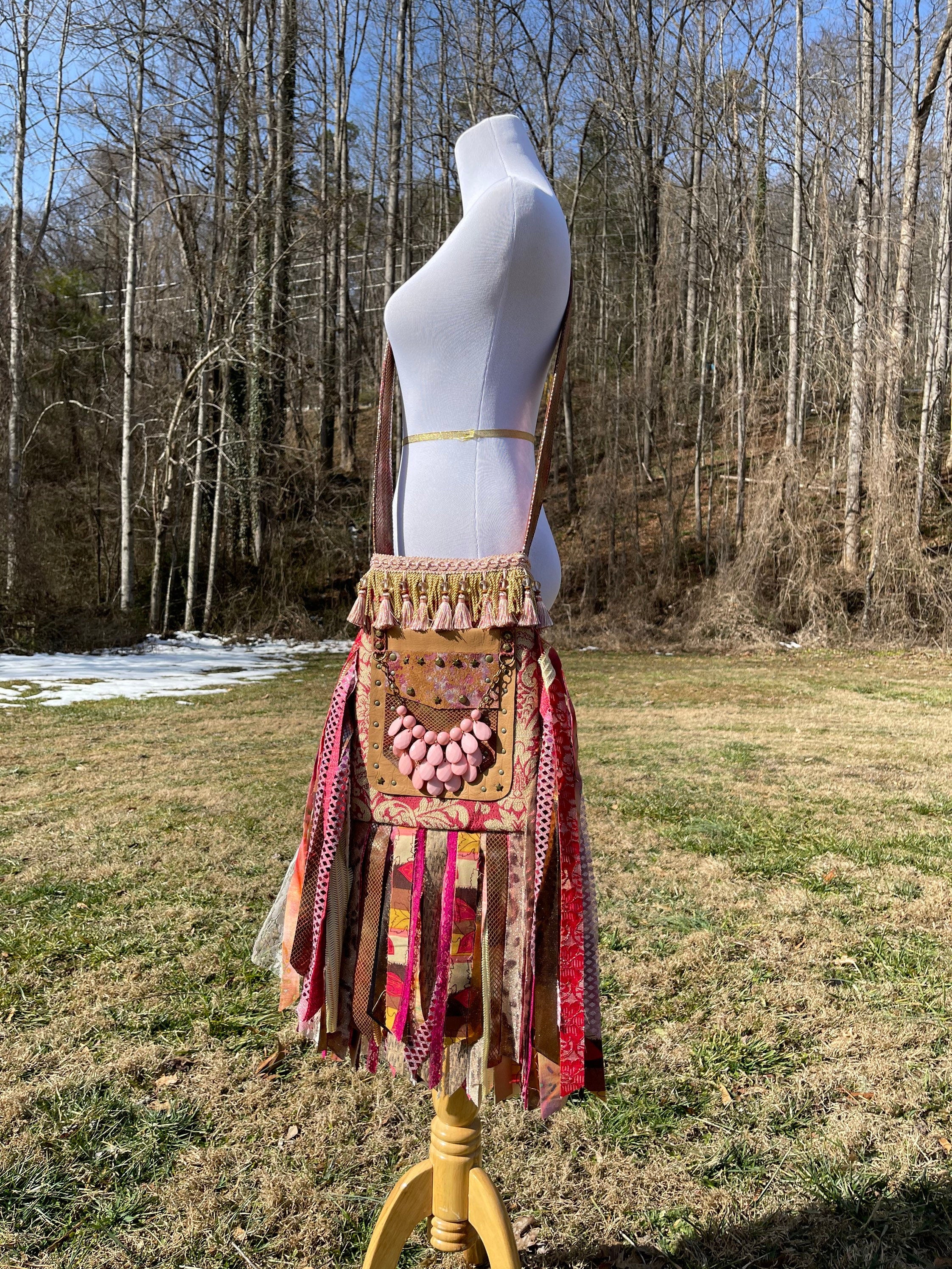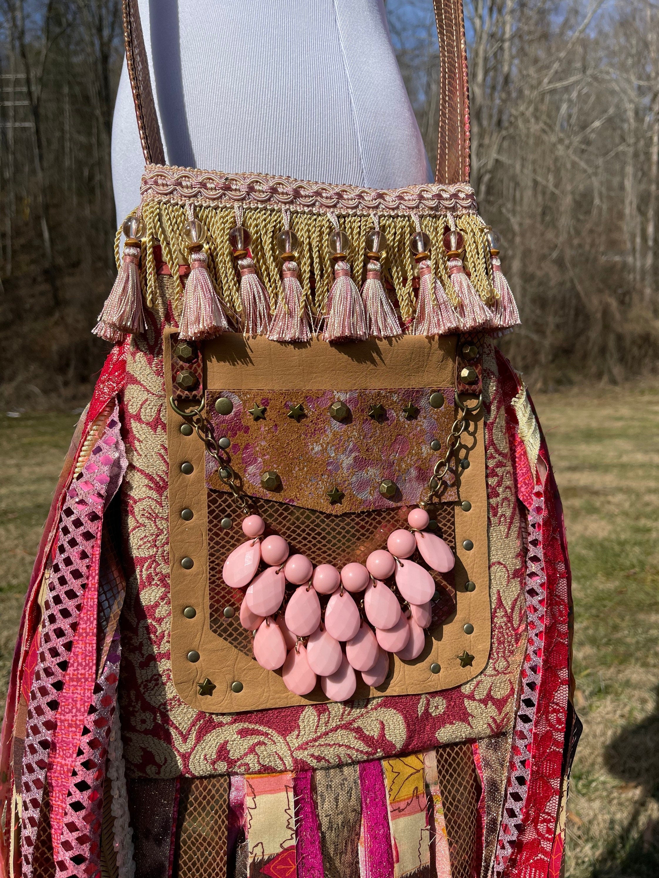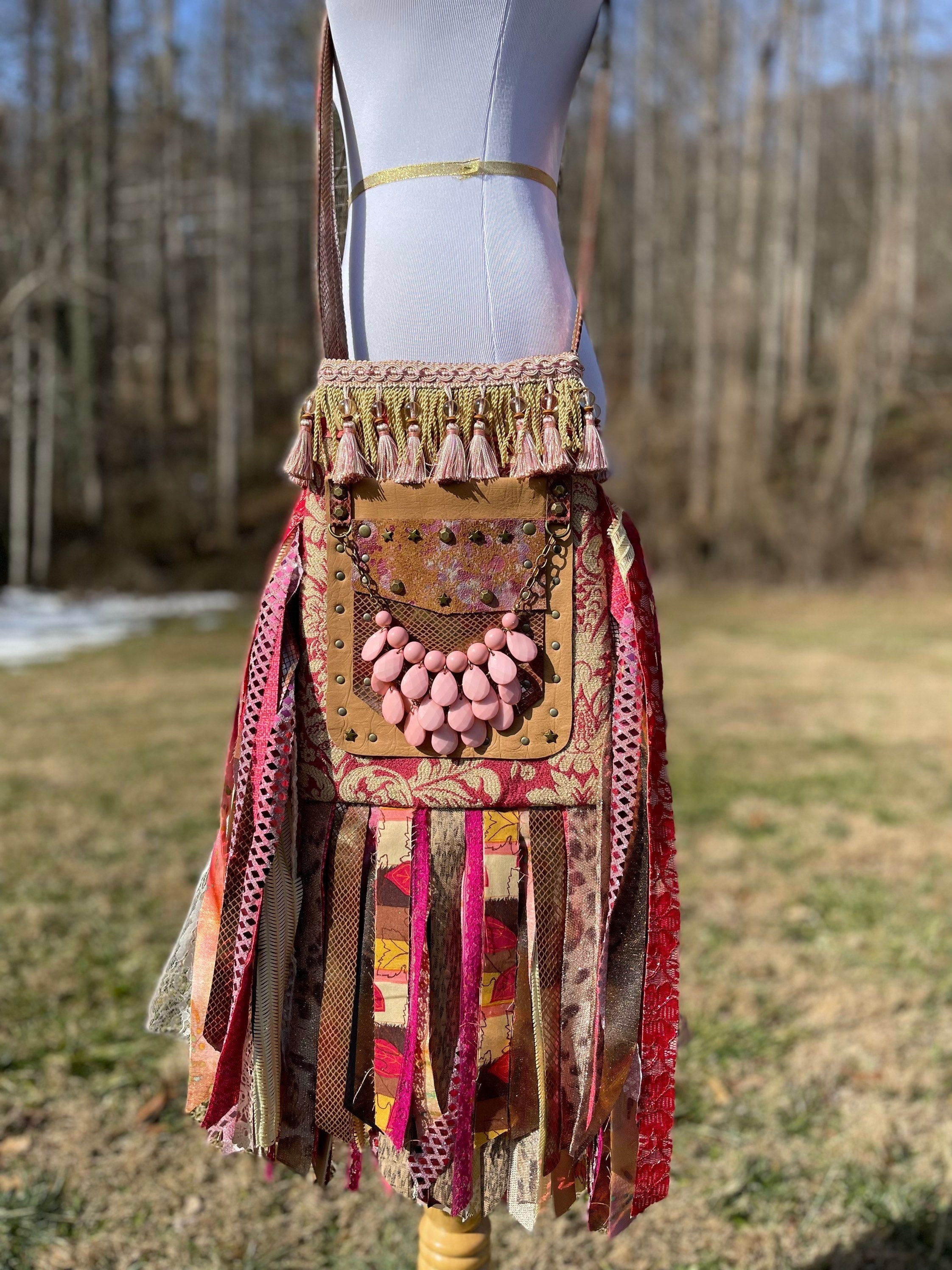 Pink Gold and Red Fringe Purse, Ultimate Boho Purse, Festival Fringe Bag, Hippie Handbag, Boho Chic Crossbody Messenger, Embellished purse