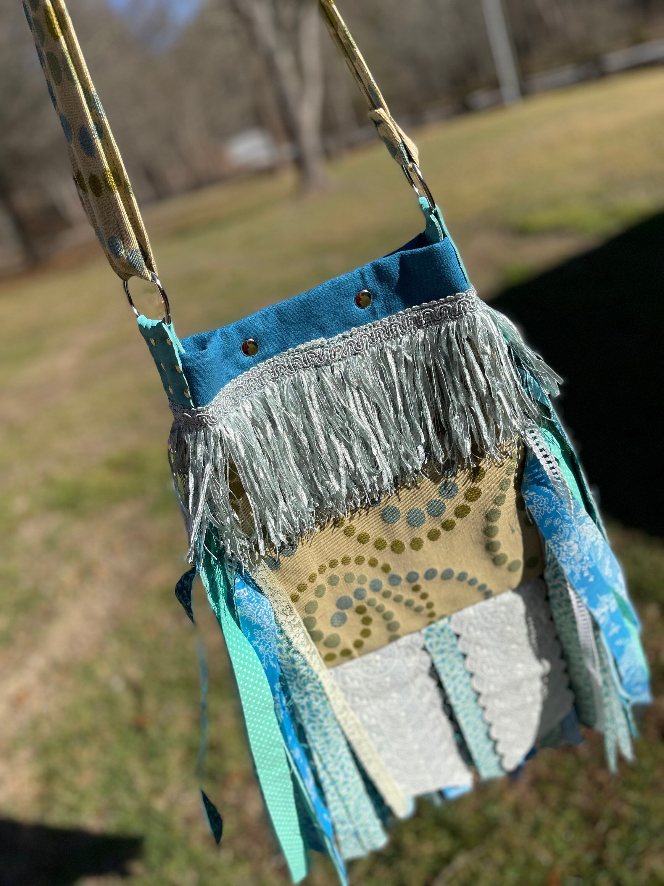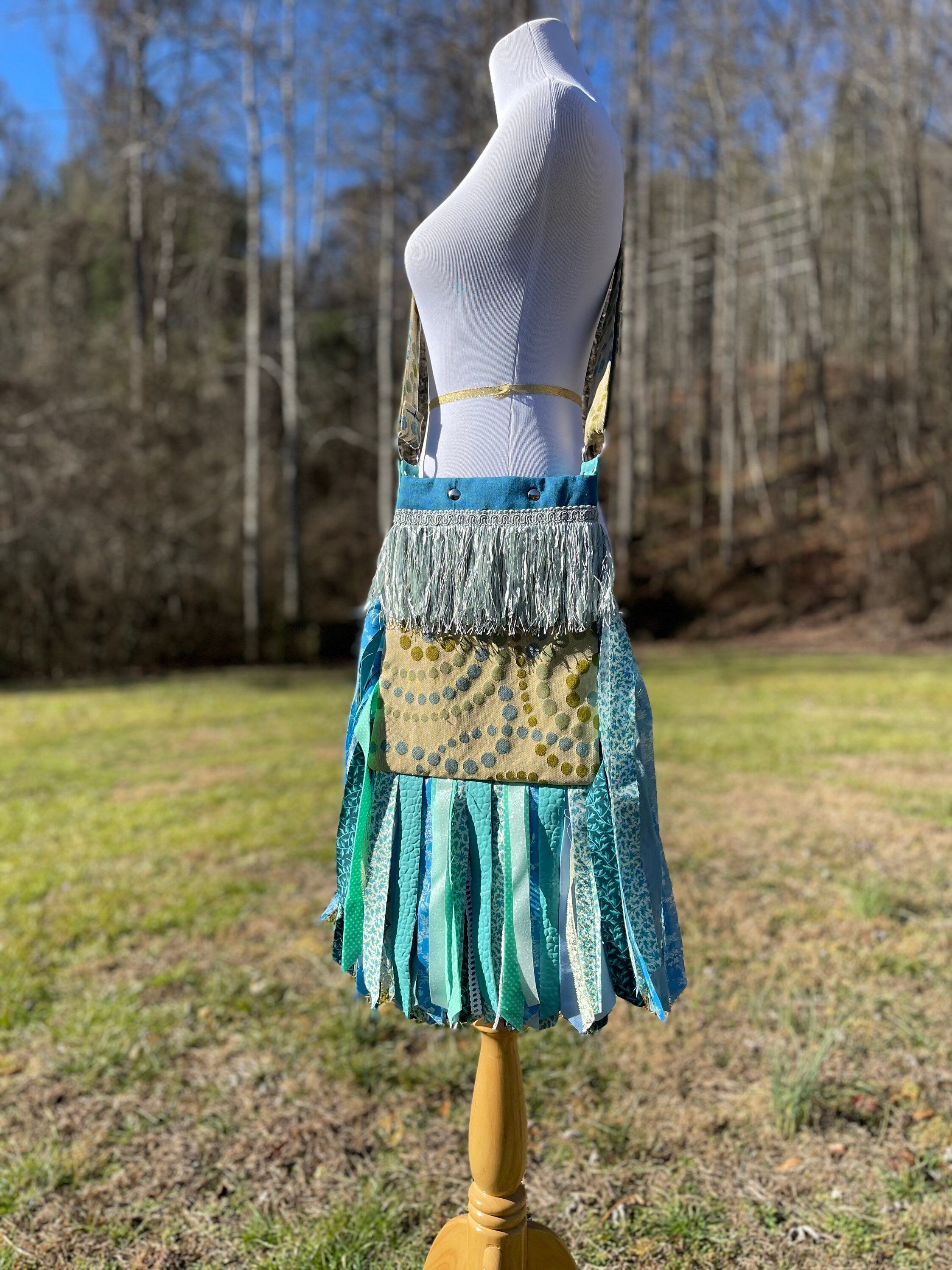 Teal and Green Bubble Print Fringe Purse, Festival Fringe Bag, Hippie Style Shoulder Bag, Crossbody Boho Purse