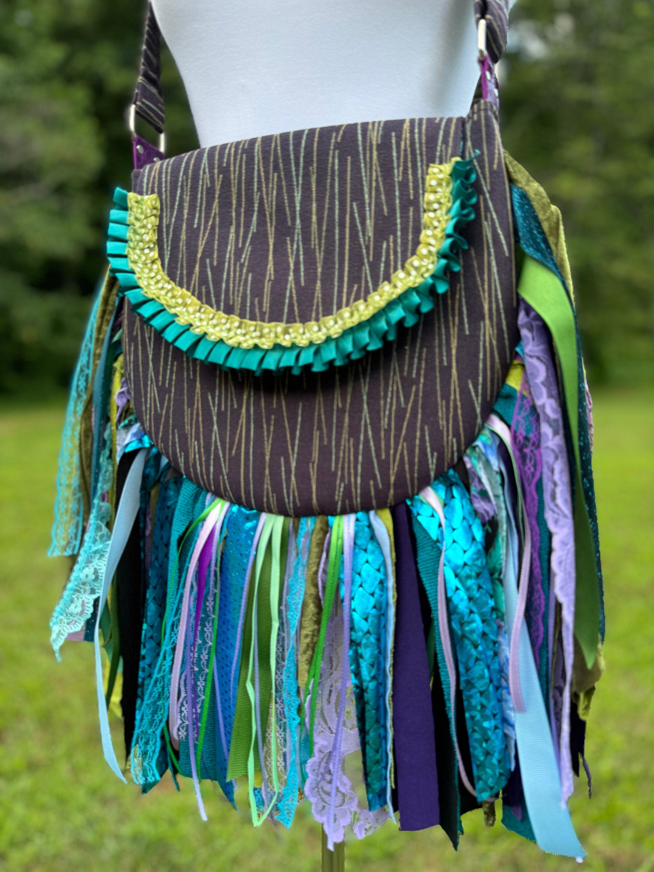 Upcycled lace fringe bag. Adjustable Strap length 31-51” Bag length 10” Bottom fringe Length 9” ish Bag width 11" 1 inside pocket...