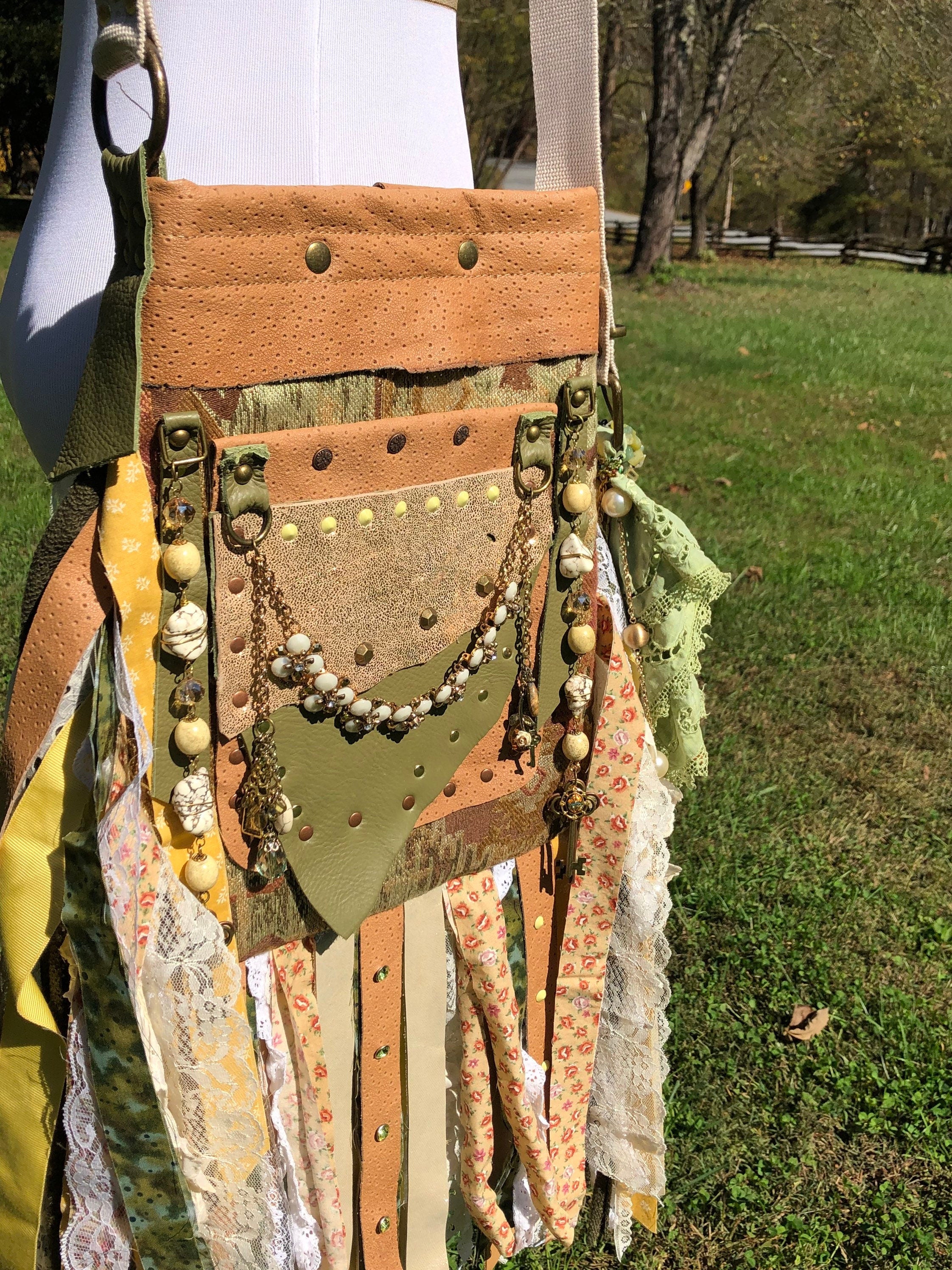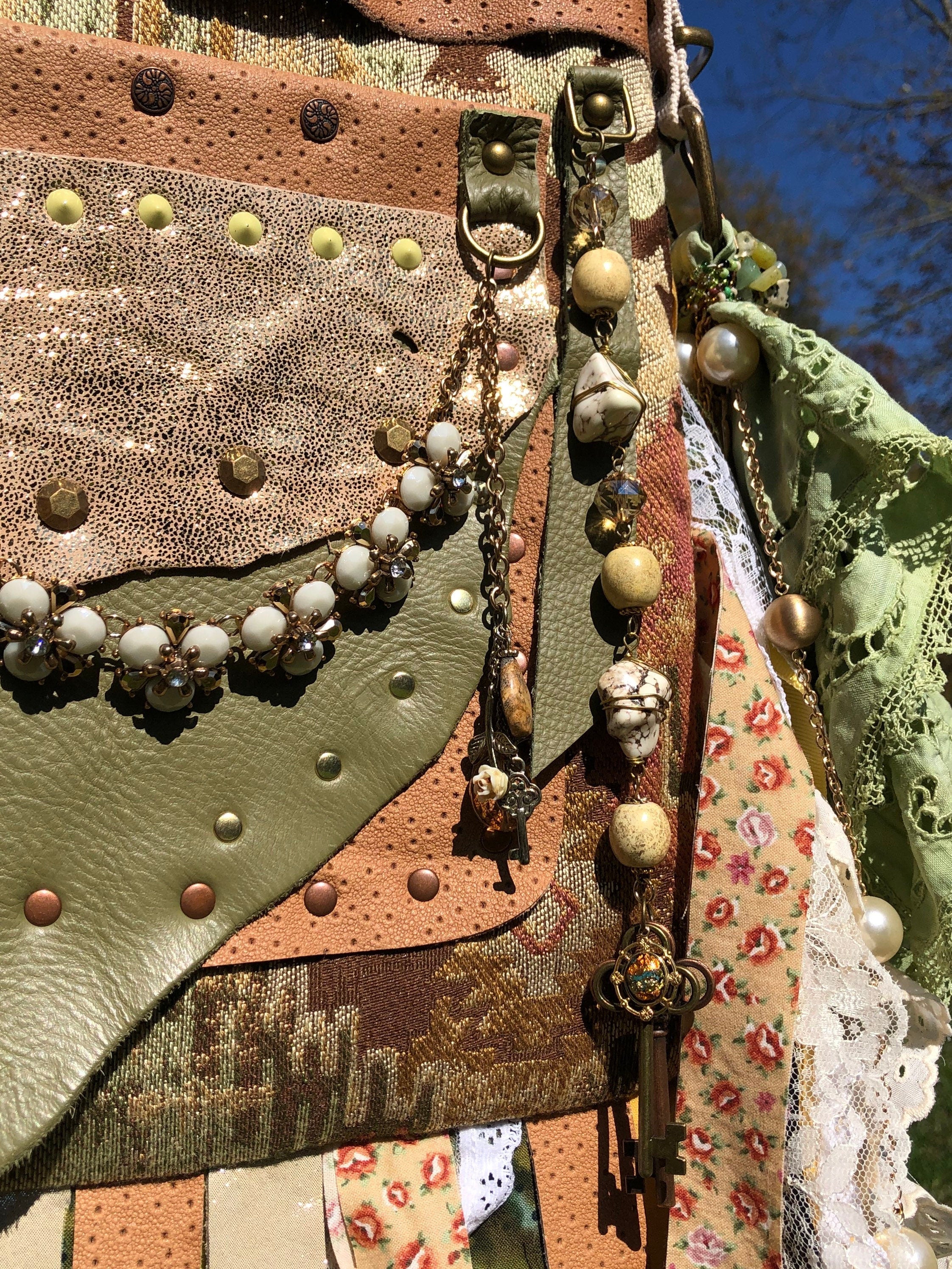 Handmade out of recycled leather scraps, recycled fabrics, vintage jewelry, deconstructed costume jewelry, belts, and sooooooo much more. So many hidden treasures all over this bag. Charms and trinkets tucked away that will shimmer in the sun.