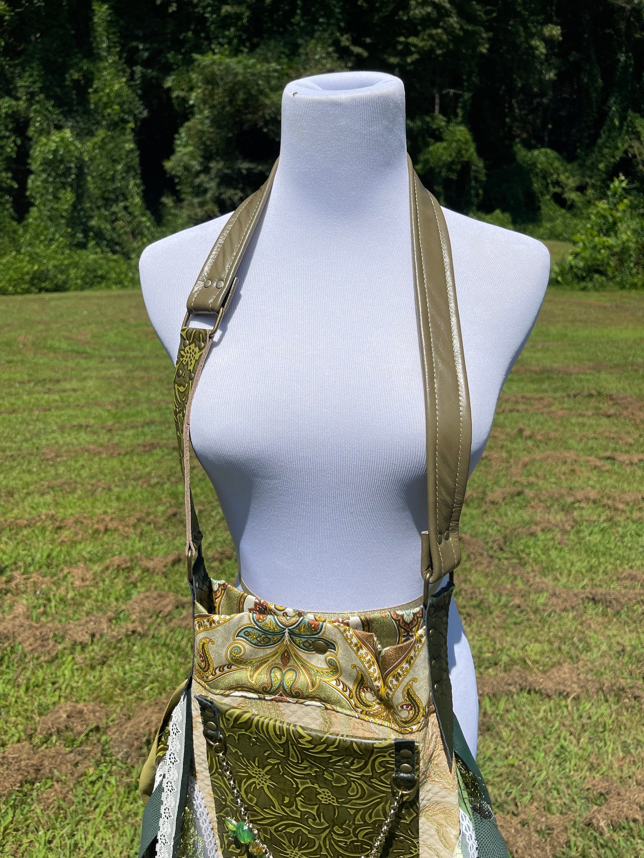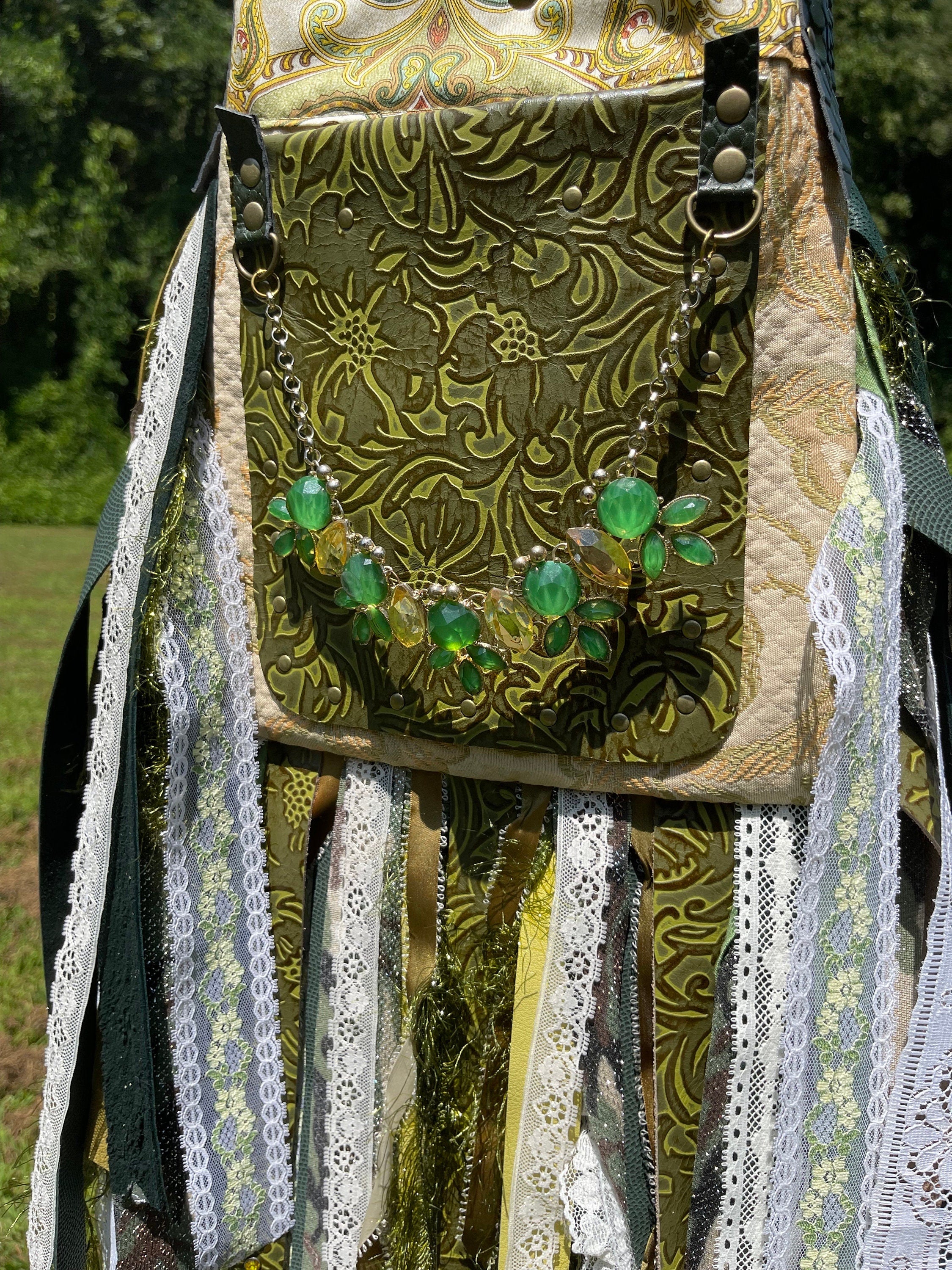 Just about everything is recycled materials, except the rivets and threads used to sew with. I use upholstery and leather scraps from mostly local stores, I hunt for belts, vintage jewelry, costume jewelry and fabrics from local shops and some etsy sellers. I deconstruct broken jewelry that would otherwise be garbage to some and make it into something new all over again.