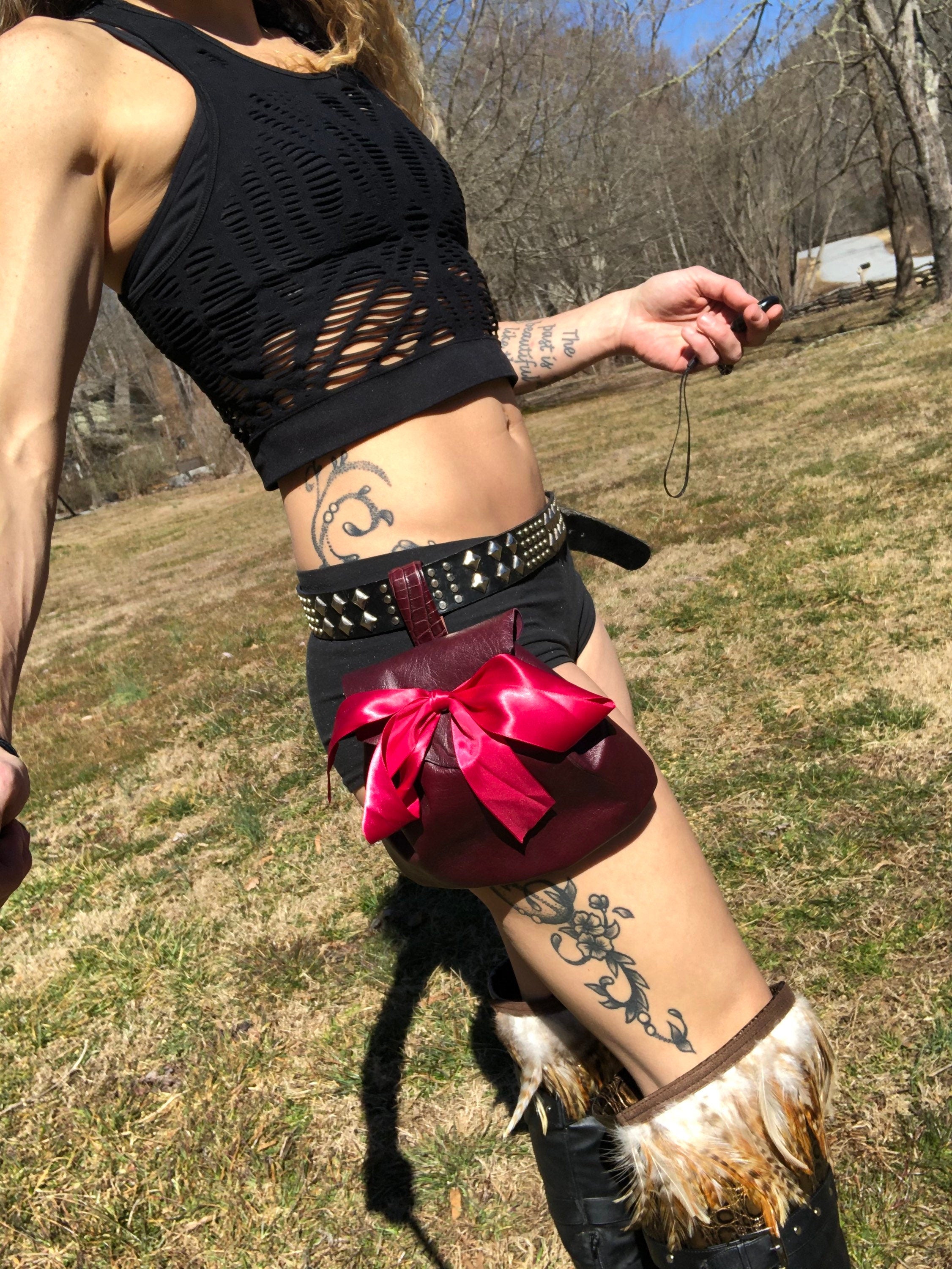 Maroon belt bag, Thigh bag, Utility bag, Leather drawstring bag, Change purse, Tarot Card bag