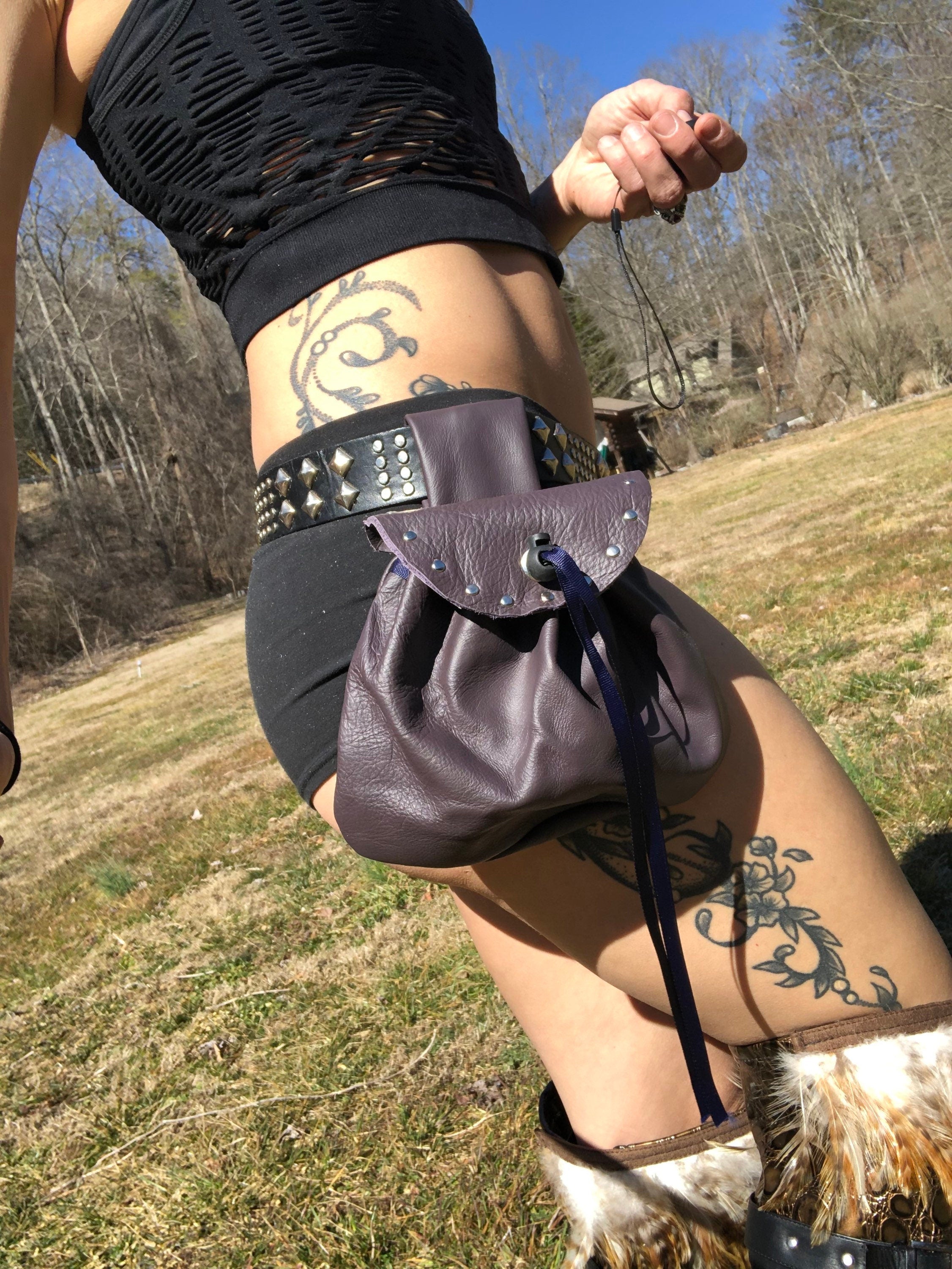 Purple Leather Belt Bag, Tarot card Bag, Small Fanny Pack, Change purse, Drawstring Bag