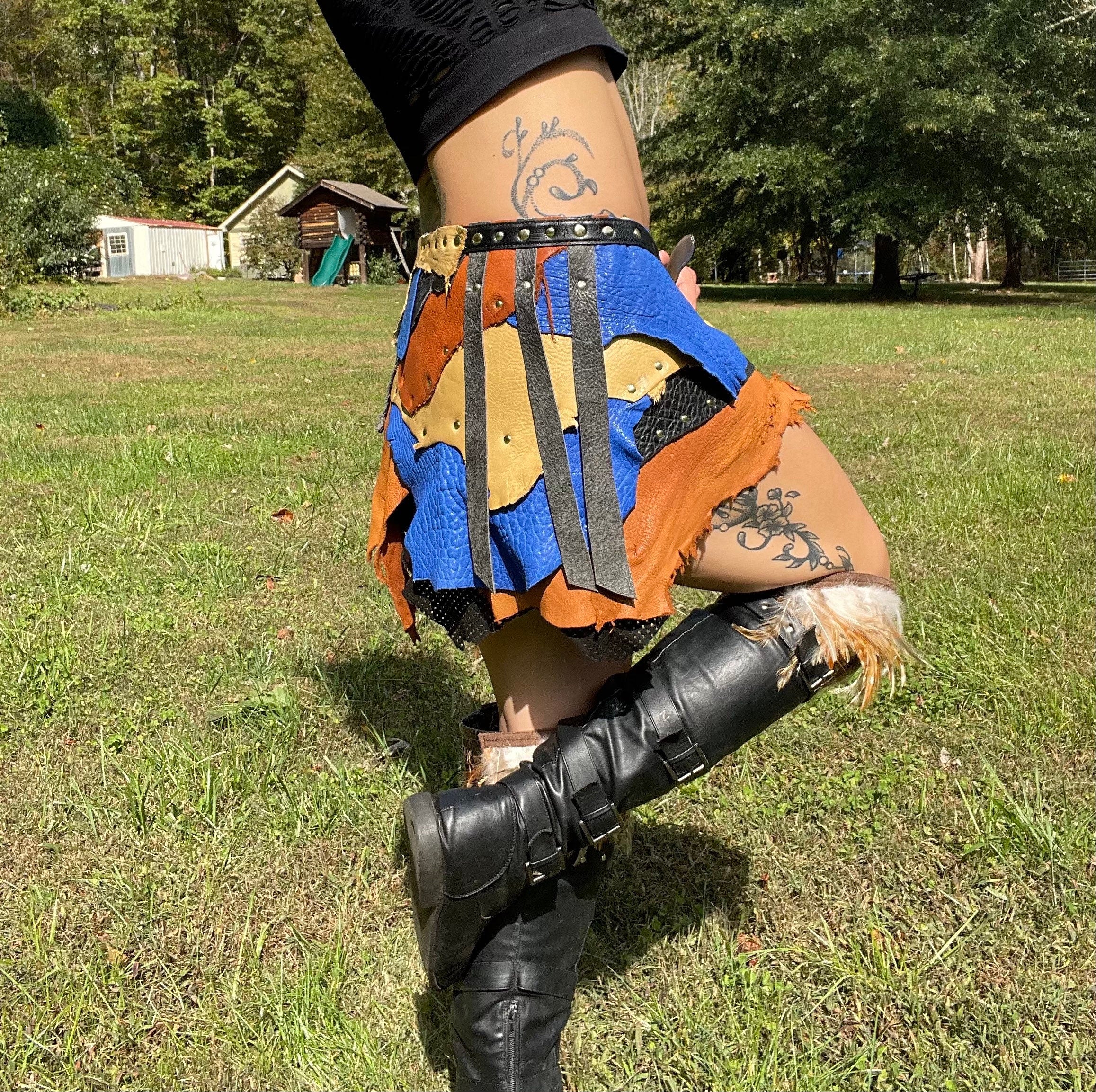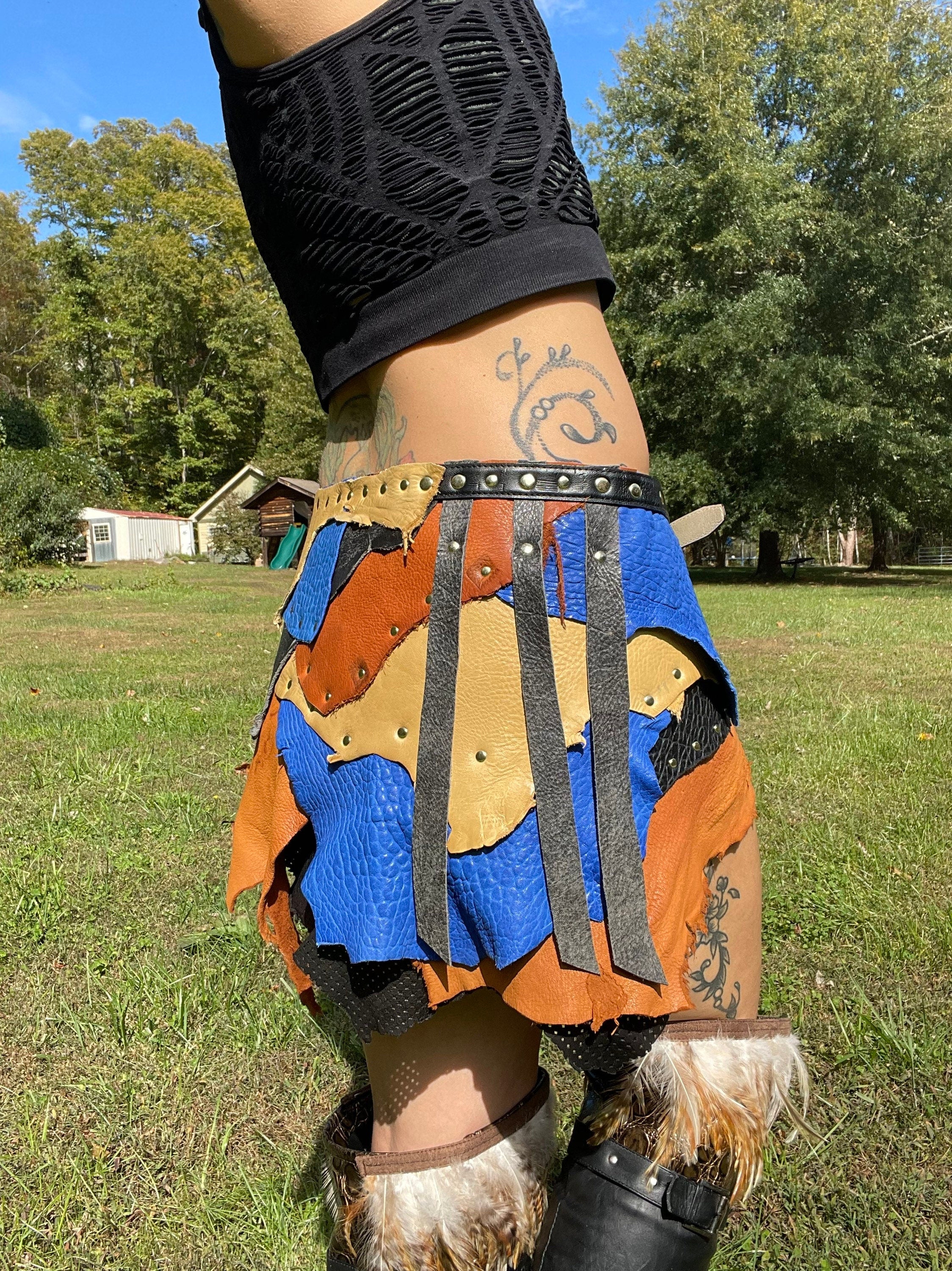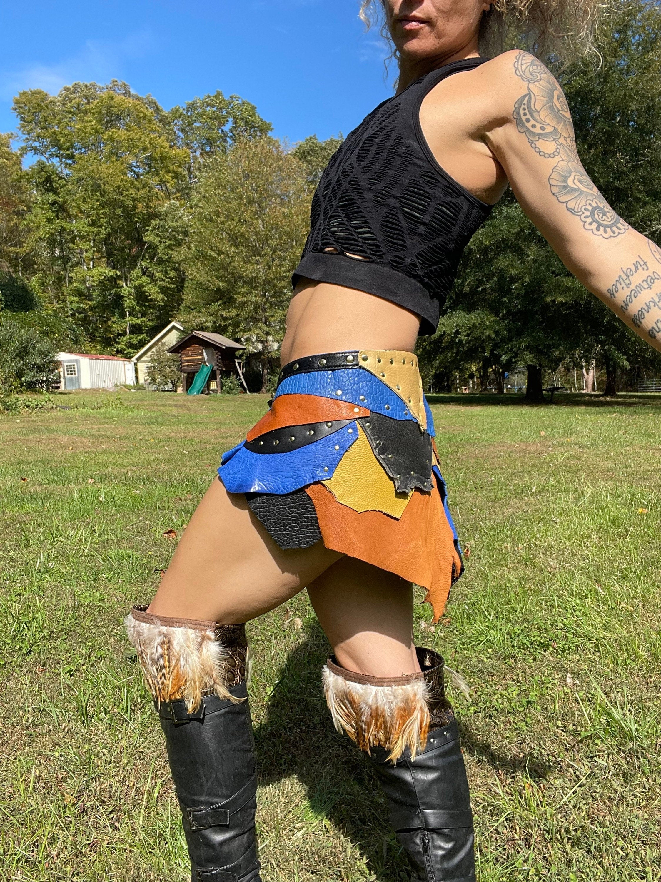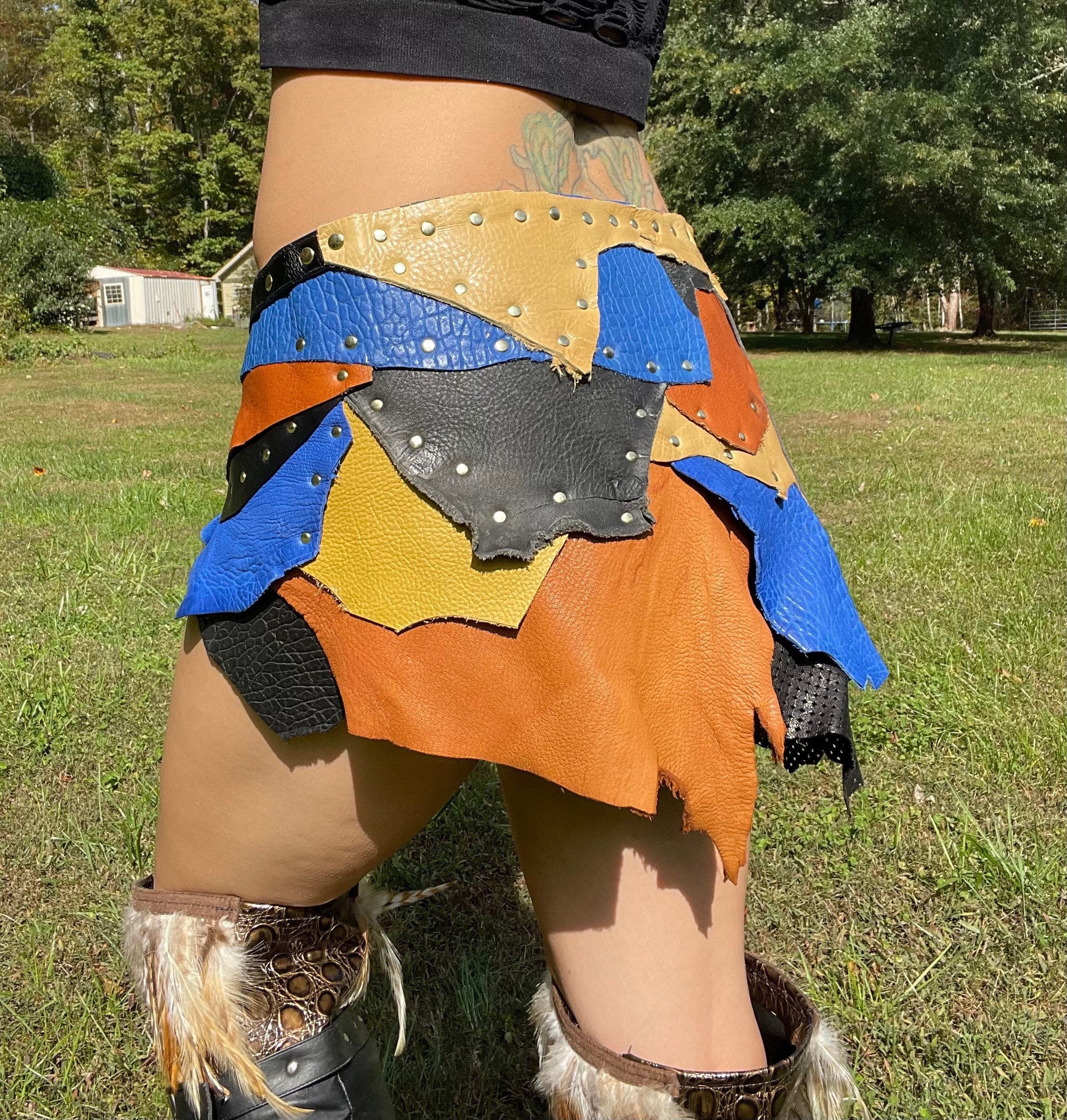 Fun and funky leather scrap mini skirt for sale. They are great over leggings, booty shorts, jeans, or skirts. Dance the night away at festivals, performances, or under the moon.